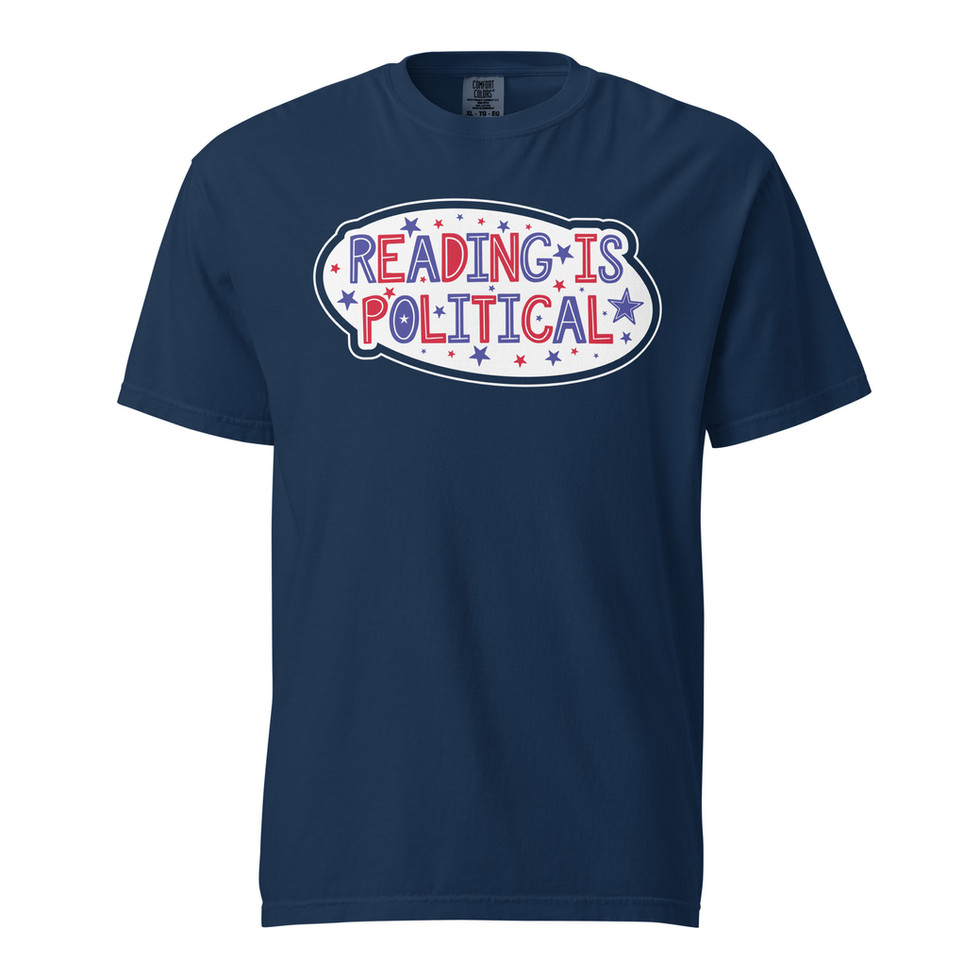 You bet reading is political. Stand for books. Stand for libraries! Is this tee a little too flashy or POLITICAL for you? Check out our other designs—including a simple embroidered CC tee!